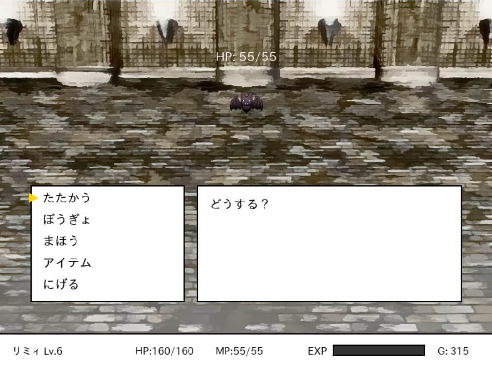 フロアを歩いていると、ランダムで魔物と遭遇します。戦闘はターン制のコマンドバトルです。勝利すると経験値やアイテムが手に入ります。 -