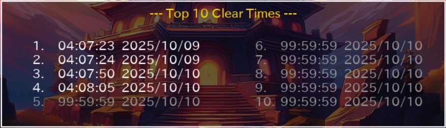 ゲームクリアまでにかかった時間が記録され、トップ10がランキングに保存されます。自己ベストの更新を目指す楽しさがあります。 -