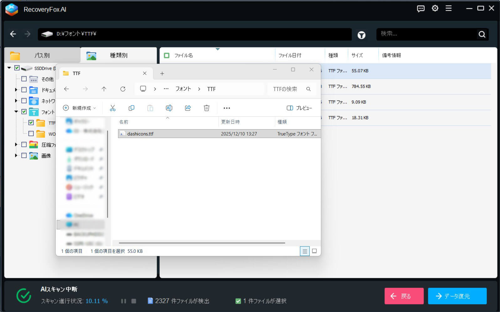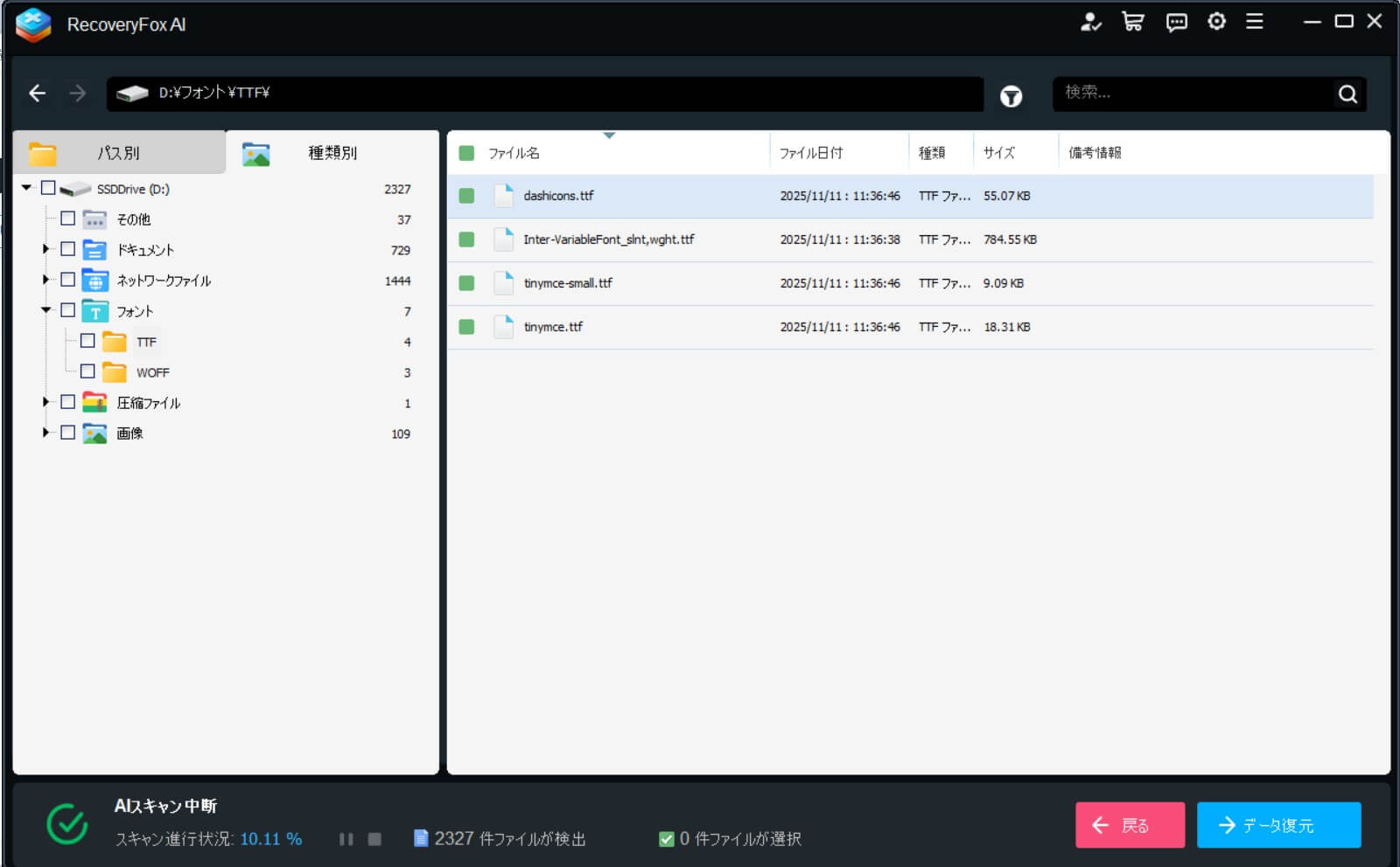ドライブを選択すると、自動的にスキャンが始まります。まずは短時間で完了する「クイックスキャン」が実行され、その後、より詳細にディスクを調査する「AIスキャン」が自動で開始されます。AIスキャンはドライブの容量によっては時間がかかる場合がありますが、スキャン中でも見つかったファイルは随時表示されていきます。