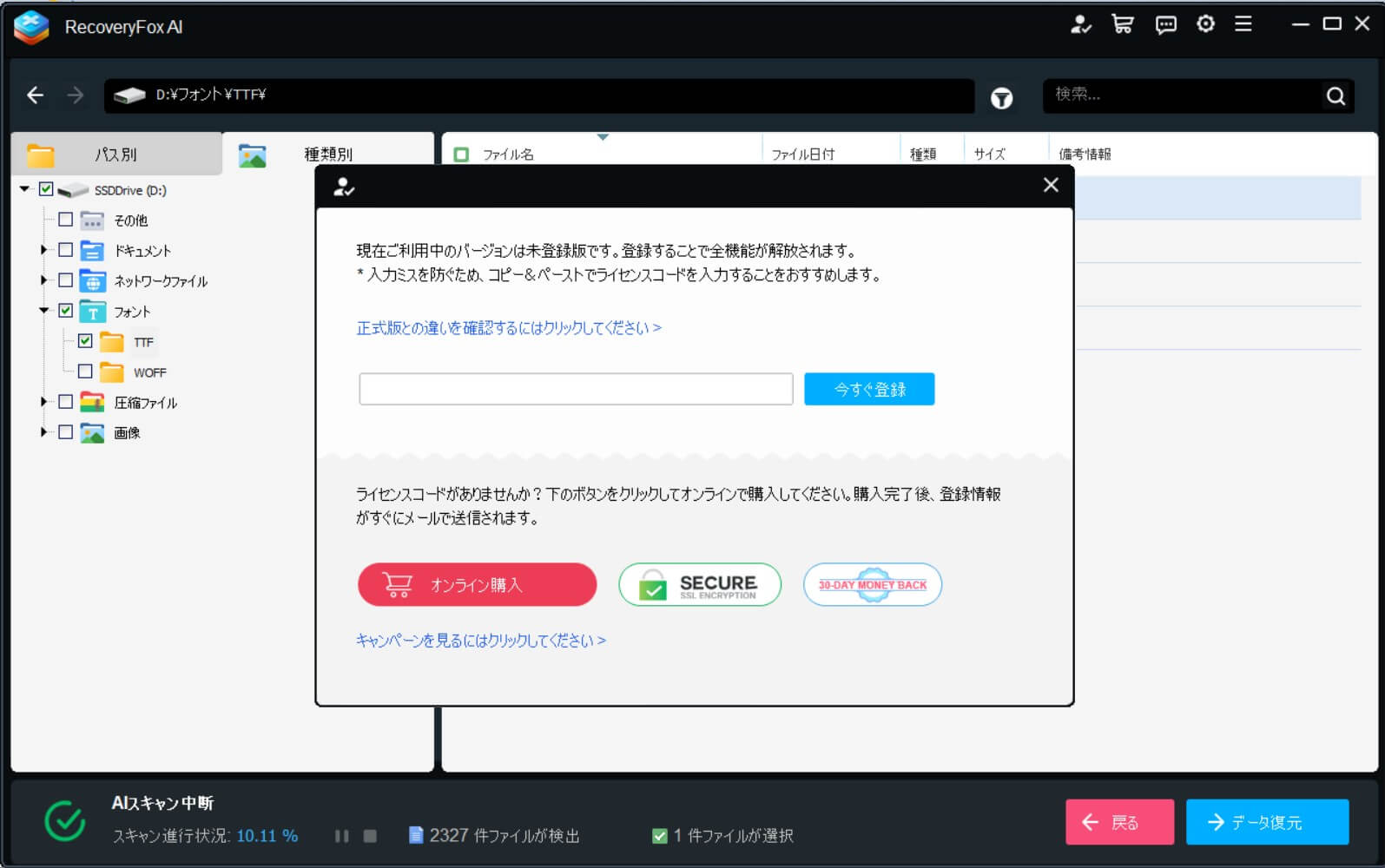 復元は有料:スキャンとプレビューは無料ですが、実際にファイルを復元するには有料のライセンスが必要です。とはいえ、復元の見込みを確認してから購入できるのは良心的なシステムと言えるでしょう。