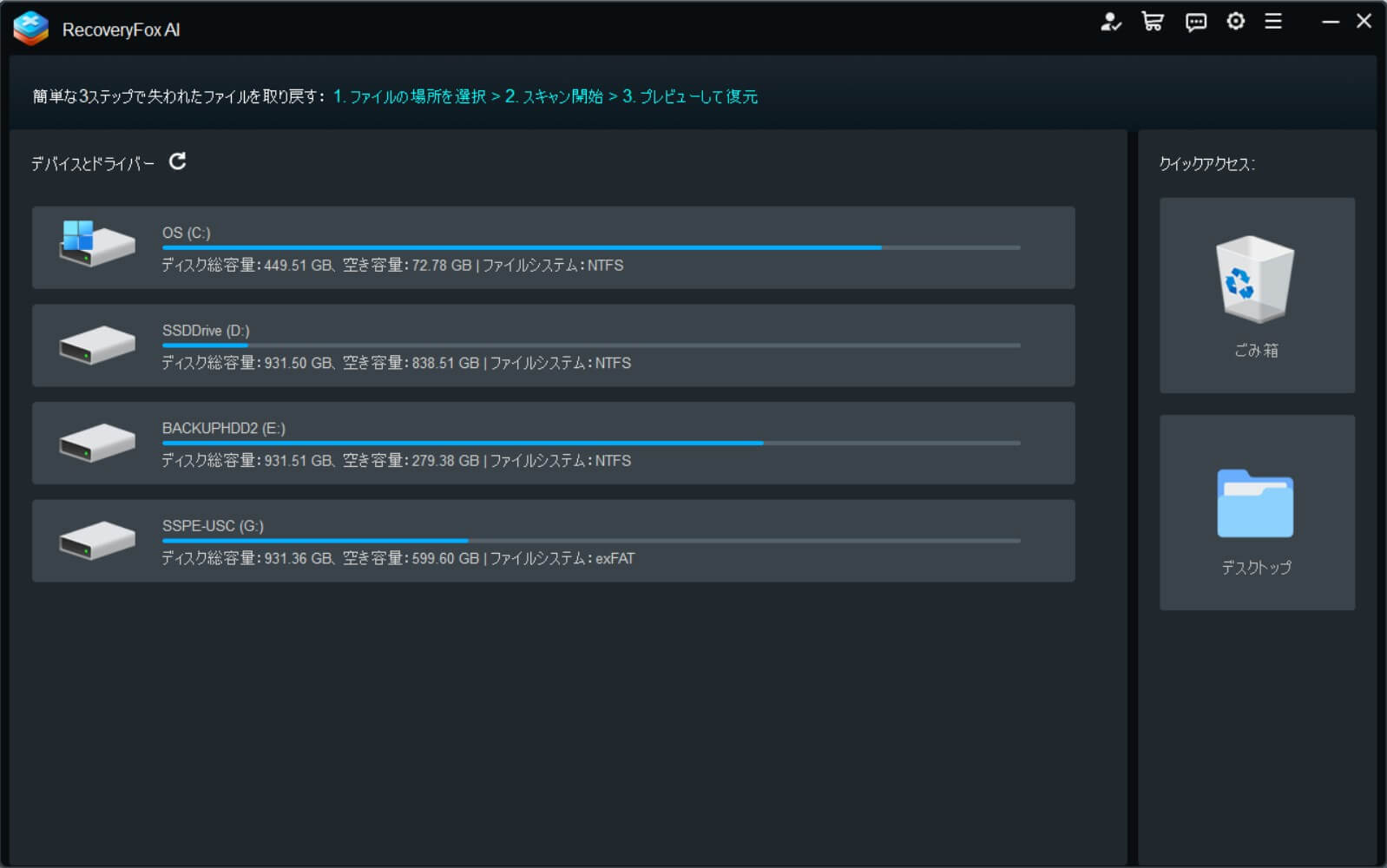 初心者にも優しい簡単な操作性: データ復元ソフトというと専門的で難しいイメージがあるかもしれませんが、RecoveryFox AIは非常にシンプルで直感的なインターフェースを備えています。基本的な操作は数クリックで完了するため、PCの専門知識がない方でも安心して利用できます。